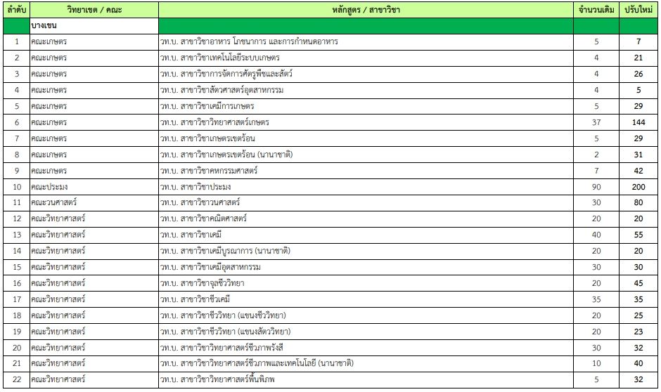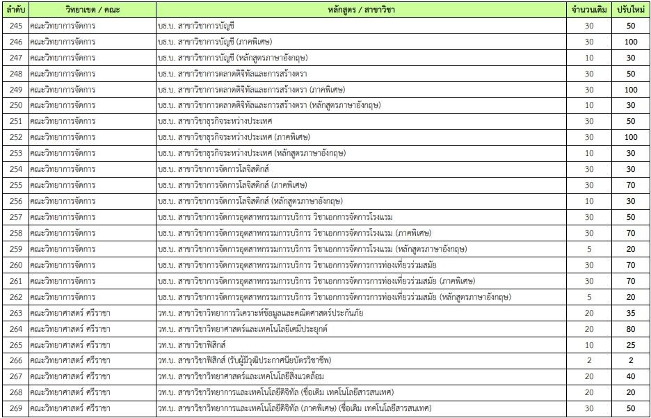 - คณะวิทยาการจัดการ (มก.ศรีราชา) บธ.บ. สาขาวิชาการจดัการ (ภาคพิเศษ) เพิ่มจาก 20 เป็น 100 ที่นั่ง