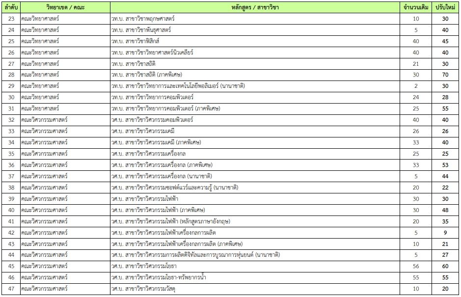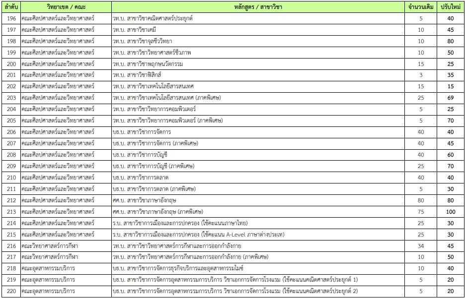 - คณะวิทยาศาสตร์ วท.บ. สาขาวิชาสถิติ(ภาคพิเศษ) เพิ่มจาก 30 เป็น 70 ที่นั่ง