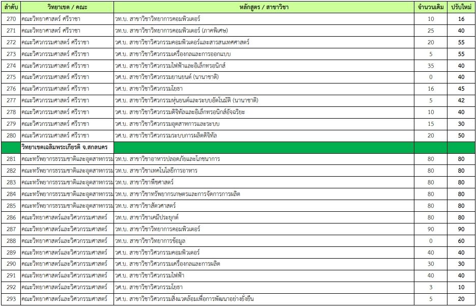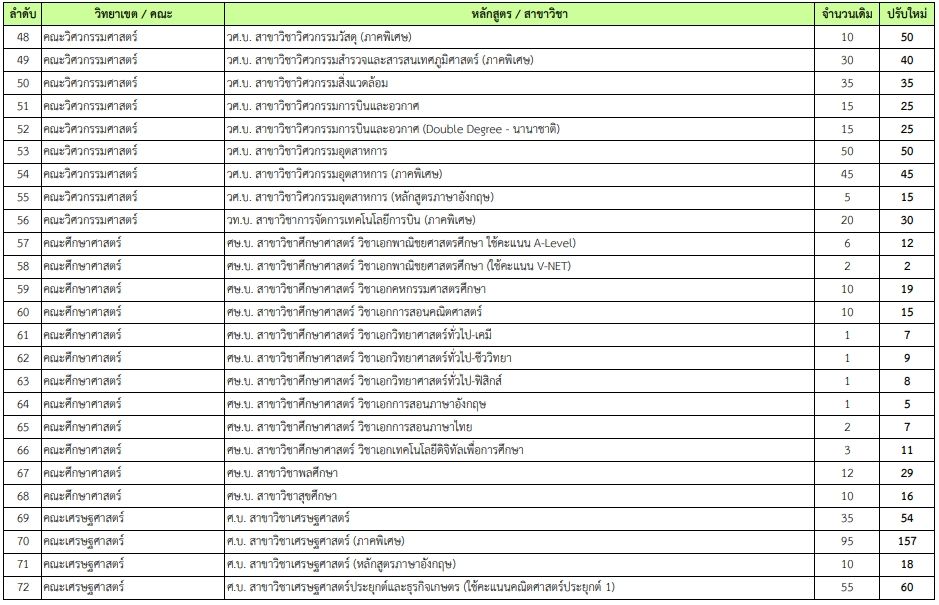 - คณะสิ่งแวดล้อม วท.บ. สาขาวิชาวิทยาศาสตร์และเทคโนโลยสีิ่งแวดล้อม เพิ่มจาก 20 เป็น 80 ที่นั่ง