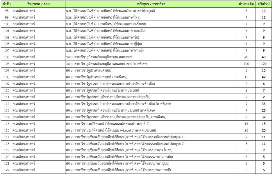 - คณะสังคมศาสตร์ ศศ.บ. สาขาวิชาสังคมวิทยาและมานุษยวิทยา (ภาคพิเศษ) เพิ่มจาก 40 เป็น 74 ที่นั่ง