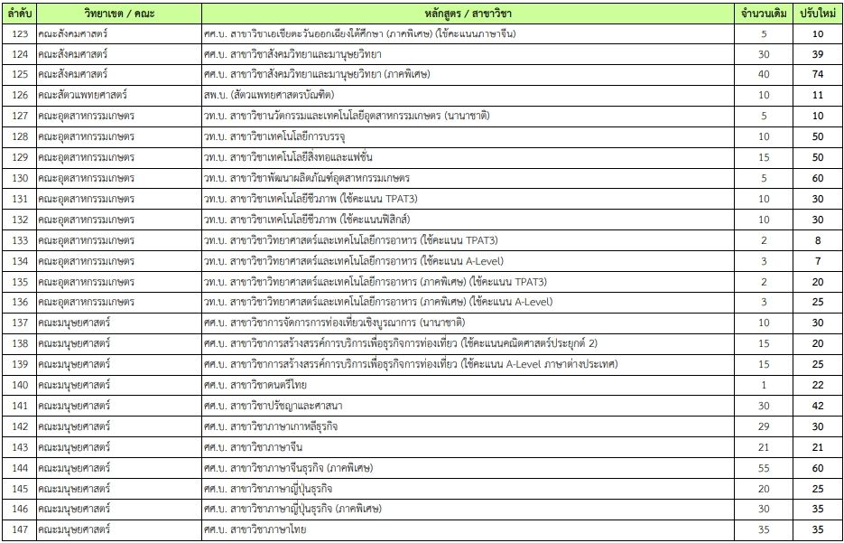 - คณะเกษตร กำแพงแสน วท.บ. สาขาวิชาเกษตรศาสตร์ (ใช้คะแนน TPAT3) เพิ่มจาก 20 เป็น 120 ที่นั่ง