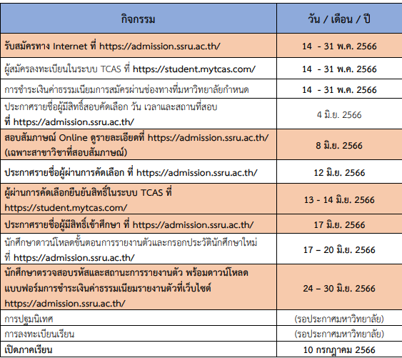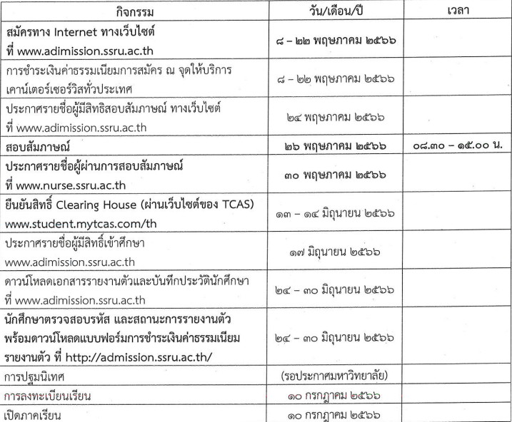 - *ต้องส่งผลการตรวจร่างกายและเอกสารประกอบการสอบสัมภาษณ์ไปที่วิทยาลัยพยาบาลและสุขภาพ ทางอีเมล nurse@ssru.ac.th หรือทางไปรษณีย์ ภายใน 25 พ.ค.66 ดูรายละเอียดเอกสารและที่อยู่การจัดส่งในระเบียบการ หน้า 3