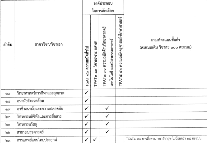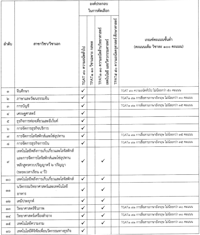 - เกณฑ์คัดเลือก : ใช้ TGAT/TPAT บางวิชามีกำหนดคะแนนขั้นต่ำ และสอบสัมภาษณ์ (บางสาขา)