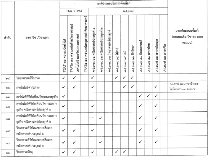- เกณฑ์คัดเลือก : ใช้ TGAT/TPAT และ A-Level บางสาขามีให้เลือกมากกว่า 1 รูปแบบ