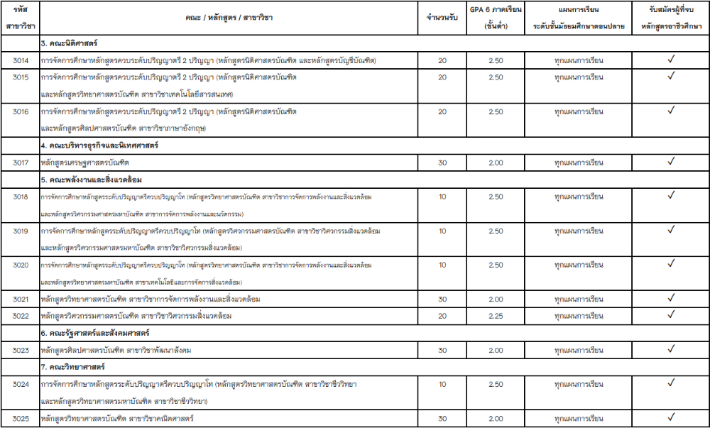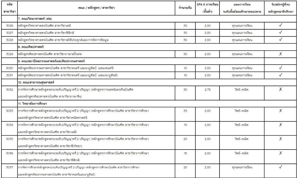 - เกณฑ์คัดเลือก : GPAX โดยเรียงจากมากไปน้อย และจะต้องผ่านเกณฑ์ขั้นต่ำที่คณะกำหนด