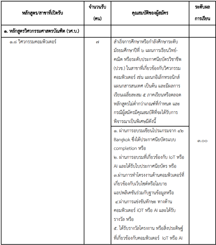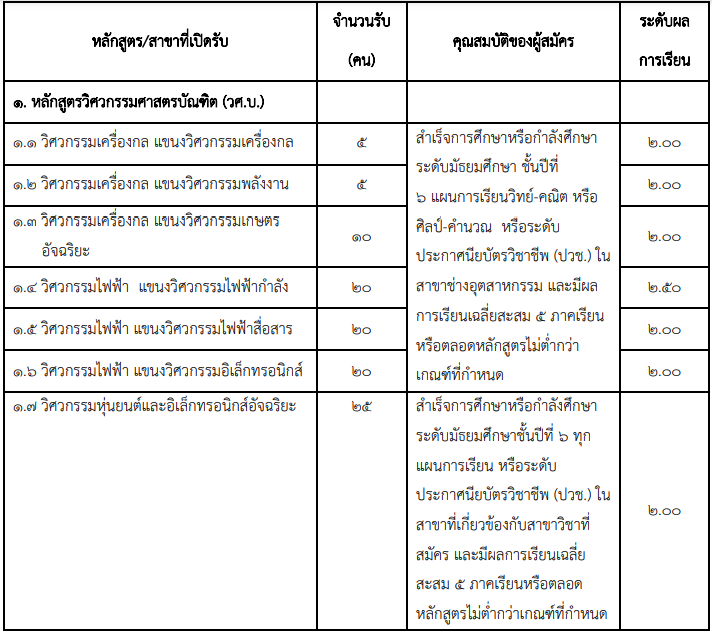 - จบ ม.6 แผนวิทย์-คณิต หรือ แผนอื่น ที่มีการเรียนการสอนวิชาคณิตศาสตร์, ฟิสิกส์, ภาษาอังกฤษ หรือ เทียบเท่า หรือ