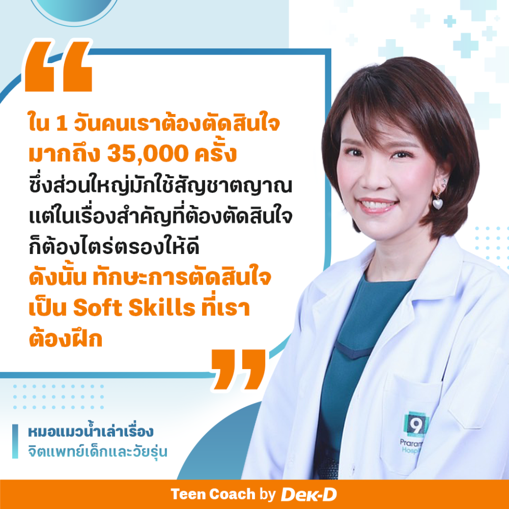 ดังนั้น “ทักษะการตัดสินใจ” (Decision Making Skills) เป็นหนึ่งใน Soft Skills ที่เราต้องฝึก เพราะเป็นทักษะที่จะช่วยให้เราเลือกวิธีการที่จะทำให้ผลลัพธ์ออกมาดีที่สุดในช่วงเวลานั้น ซึ่งต้องใช้ทักษะหลายอย่างประกอบกัน เช่น การแก้ปัญหา (Problem-solving), การใช้เหตุผล (Reasoning), สัญชาตญาณการเอาตัวรอด (Intuition), การจัดการเวลา (Time management), สร้างสรรค์คิดสิ่งใหม่ (Creativity), ความฉลาดทางอารมณ์ (Emotional Intelligence), มีระบบในการทำงาน (Organization)