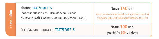 - ข้อสอบ TGAT/TPAT 2-5 มี 6 วิชา วิชาละ 140 บาท เลือกวิชาสอบได้ ได้แก่