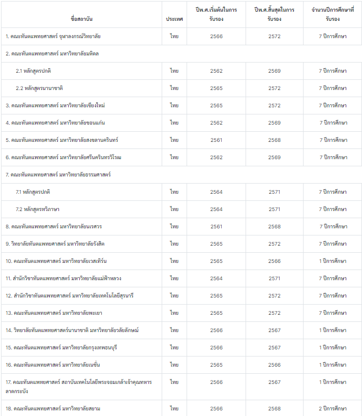 น้องๆ จะเห็นว่าจำนวนปีที่ได้รับการรับรองของแต่ละสถาบันนั้นไม่เท่ากัน มหาวิทยาลัยที่ได้รับการรับรอง 7 ปีนั้นคือเป็นหลักสูตรที่ผ่านการรับรองปกติค่ะ ส่วนมหาวิทยาลัยที่ได้รับการรับรอง 1 ปี คือได้รับการรับรองแบบมีเงื่อนไข คนที่เข้าเรียนในปีนั้นสามารถสอบใบประกอบวิชาชีพได้ปกติ แต่มหาวิทยาลัยจะต้องมีการส่งข้อมูลเพื่อรับรองอย่างต่อเนื่อง มักจะเป็นมหาวิทยาลัยที่เพิ่งเปิดหลักสูตรนั้น หรือ ปีนั้นได้มาตรฐานไม่เป็นตามเกณฑ์ค่ะ เราลองไปดูรายละเอียดกัน