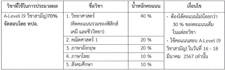 - เกณฑ์การคัดเลือกยังใช้เกณฑ์เดิม คือ วิชาเฉพาะ กสพท (TPAT1) 30% และ A-Level 70%