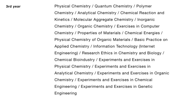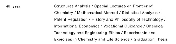 ต้องทำความเข้าใจก่อนว่าคอนเซ็ปต์วิศวะที่ไทยกับญี่ปุ่นต่างกัน อย่างของไทยเราจะติดภาพผสมกันระหว่างวิศวกรและช่าง แต่ที่ญี่ปุ่น วิศวกรคือผู้คิดค้นและพัฒนาสิ่งใหม่ๆ พื้นฐานวิทย์ต้องแน่น อาจมีจำสูตรบ้างแต่หลักๆ คือเข้าใจและประยุกต์ได้ ดังนั้นวิศวะเคมีก็เลยจะใกล้เคียงกับวิทยาศาสตร์เคมี