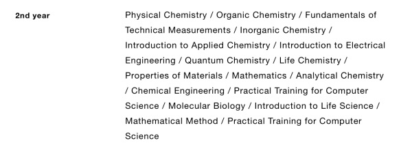 ตัวอย่างวิชาก็เช่น ฟิสิกส์ 1 เรียนเรื่องกลศาสตร์, ฟิสิกส์ 2 เรียนเรื่องแม่เหล็กไฟฟ้า, วิชาคณิตมีเรื่อง Calculus, Linear Algebra โคตรยากกกกก แล้วตอนสอบเจอโจทย์ประมาณว่ากำหนด Polygon มารูปนึง ถ้าฉายแสงลง Polygon มุมใดๆ เงาจะมีขนาดเท่าไหร่ ทุกวันนี้ยังหาคำตอบไม่ได้เลยครับ 55555