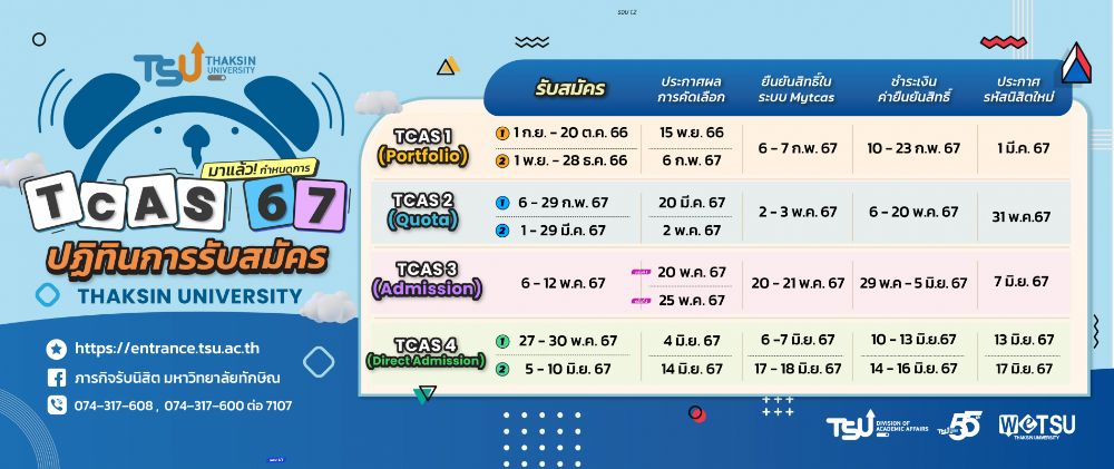 มาอีกที่แล้ว! กำหนดการ TCAS67 มหาวิทยาลัยทักษิณ เริ่มรอบแรก 1 ก.ย. นี้แล้ว