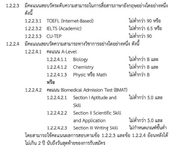 - มี GPA กลุ่มวิชาวิทยาศาสตร์ เฉพาะวิชาเคมีและชีววิทยา จะต้องได้วิชาละไม่ต่ำกว่า 3.00
