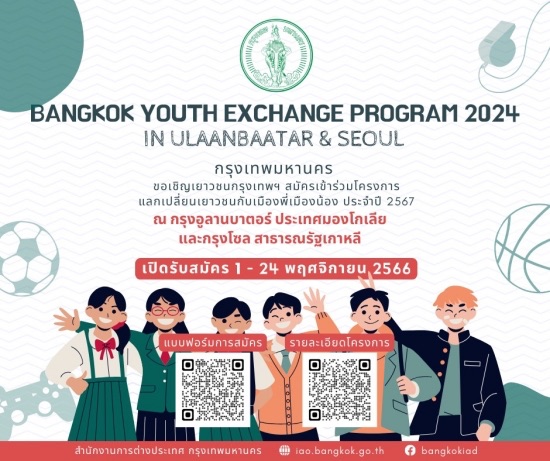 สวัสดีค่ะชาว Dek-D น้องๆ เยาวชนกรุงเทพฯ อายุ 15-18 ปีที่อยากไปแลกเปลี่ยนทริปสั้นๆ สัมผัสบรรยากาศและวัฒนธรรมในต่างแดน ห้ามพลาดโอกาสนี้ค่ะ! ล่าสุดทาง "สำนักงานการต่างประเทศ กทม." ได้จัดโครงการแลกเปลี่ยนกับเมืองพี่เมืองน้อง ประจำปี 2567 หรือ Bangkok Youth Exchange Program 2024 in Ulaanbaatar & Seoul ร่วมกับ กรุงโซล สาธารณรัฐเกาหลี และ กรุงอูลานบาตอร์ ประเทศมองโกเลีย