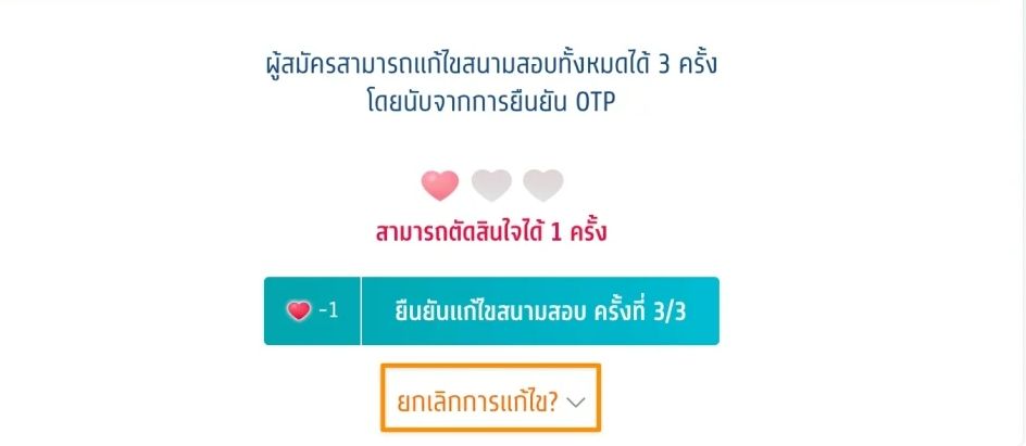 หลังจากยืนยันรหัส OTP และชำระค่าสมัคร แล้ว จะสามารถแก้ไขข้อมูลการสมัครได้ไม่เกิน 3 ครั้ง โดยระบบจะนับที่การยืนยันรหัส OTP ซึ่งก็คือจำนวนหัวใจในระบบนั่นเอง