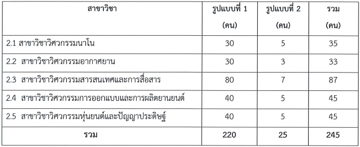 - สาขาที่เปิดรับได้แก่ สาขาวิชาวิศวกรรมอากาศยาน, สาขาวิชาวิศวกรรมการออกแบบและการผลิตยานยนต์, สาขาวิศวกรรมนาโน, สาขาวิชาวิศวกรรมสารสนเทศและการสื่อสาร, สาขาวิชาวิศวกรรมหุ่นยนต์และปัญญาประดิษฐ์