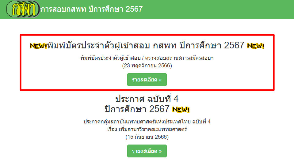 เข้าไปที่เว็บไซต์ http://www9.si.mahidol.ac.th/ แล้วกดปุ่ม รายละเอียด ตรง "พิมพ์บัตรประจำตัวสอบ กสพท ปีการศึกษา 2567