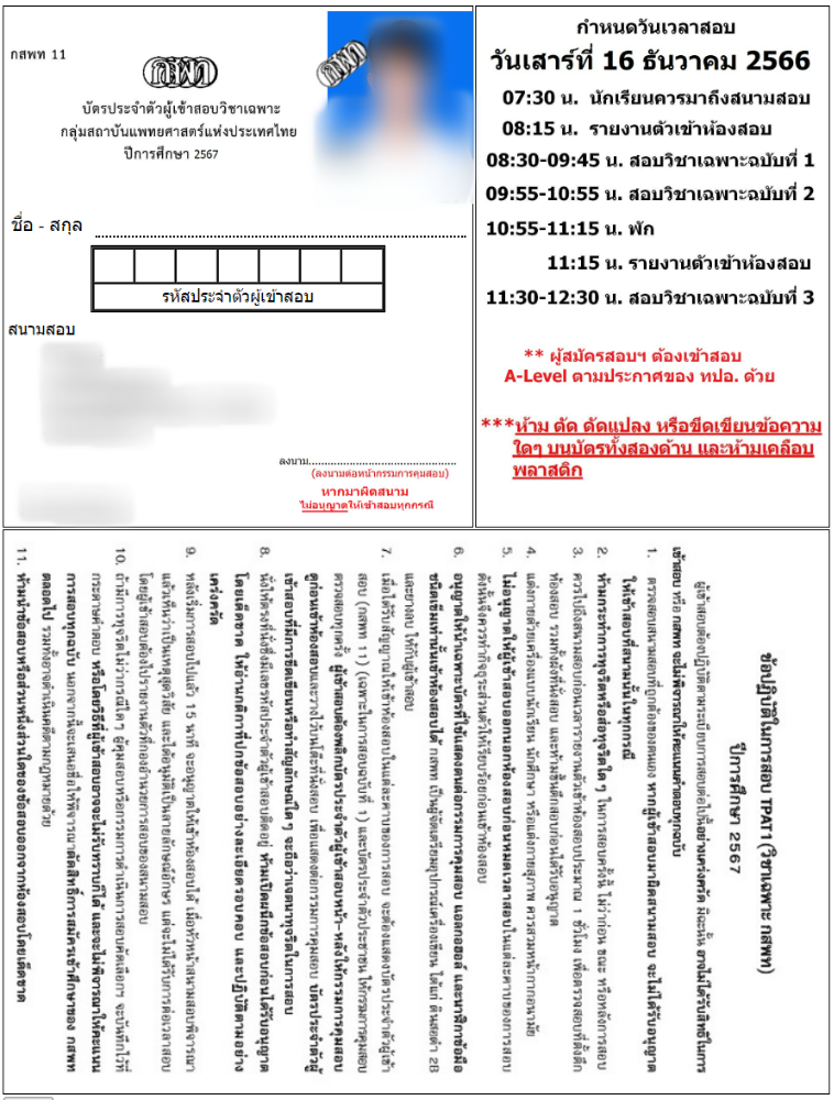 สวัสดีค่ะน้องๆ เมื่อปลายเดือนพฤศจิกายน 2566 ทาง ทปอ.ก็ได้ประกาศสนามสอบ TGAT/TPAT 2 - 5 และเปิดระบบให้พรินต์บัตรประจำตัวผู้เข้าสอบไปเรียบร้อยแล้ว ล่าสุดเป็นคราวของ TPAT1 หรือวิชาเฉพาะ กสพท กันบ้าง ระหว่างที่ 1 - 16 ธันวาคม 2566 นี้ กสพท จะเริ่มให้พิมพ์บัตรประจำตัวผู้เข้าสอบได้แล้ว โดยทุกคนที่สมัครสอบ และมีสิทธิ์เข้าสอบ จะต้องทำการพิมพ์บัตรนี้ และนำไปแสดงกับกรรมการคุมสอบก่อนเข้าห้องสอบด้วย นอกจากนี้ภายในบัตรจะระบุสนามสอบที่จะต้องเข้าสอบของแต่ละคนด้วย