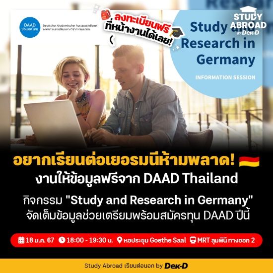 มาแล้ว! งานแรกของปีจาก DAAD Thailand กับกิจกรรมให้ข้อมูล "Study and Research in Germany" และข้อมูลทุนรัฐบาลเยอรมนี สำหรับผู้สมัครจากประเทศไทย ใครที่มีแพลนจะเรียนต่อในระดับปริญญาโทขึ้นไปหรือมีความสนใจด้านการศึกษาวิจัย และอยากหาแหล่งทุนในการเซฟงบค่าใช้จ่าย บอกเลยว่าห้ามพลาดงานนี้ เพราะเจ้าหน้าที่จาก DAAD Thailand จะมาแชร์ข้อมูลเตรียมตัวสมัครแบบ exclusive สุดๆ เพื่อช่วยให้ผู้ที่สนใจเรียนต่อที่เยอรมนีได้วางแผนเตรียมพร้อมอย่างถูก step // งานฟรี ลงทะเบียนที่หน้างานได้เลย!