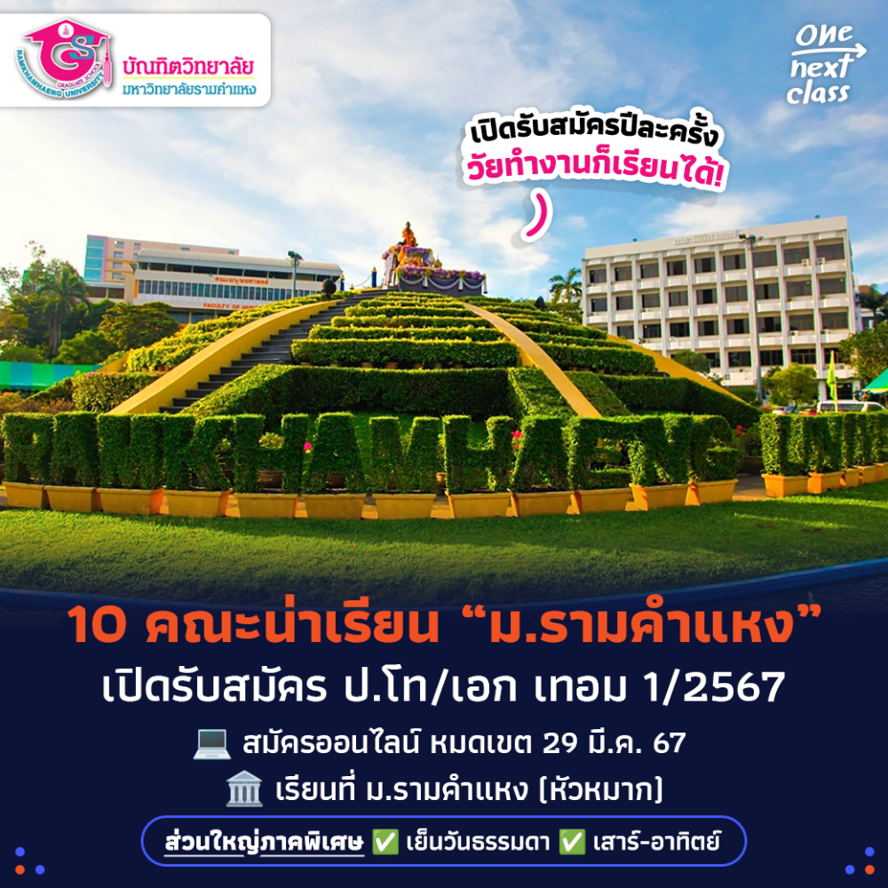 สวัสดีค่ะชาว Dek-D วัยเรียนหรือวัยทำงานคนไหนวางแผนจะลุยต่อ "ปริญญาโท" หรือ "ปริญญาเอก" อีกสักใบ เพื่อเปิดโอกาสให้ตัวเองได้ศึกษาเจาะลึกสายที่ชอบ รวมถึงขยายโอกาสการทำงานในสายที่ต่างหรือระดับที่สูงขึ้น วันนี้ One Next Class #ชีวิตติดเรียนรู้ ขอมาอัปเดตข่าวดีว่า “บัณฑิตศึกษา มหาวิทยาลัยรามคำแหง” กำลังเปิดรับสมัครนักฏศึกษาใหม่ ภาคเรียนที่ 1 ปีการศึกษา 2567 รวมมากกว่า 30 หลักสูตรจาก 10 คณะ ซึ่งจะเปิดรับสมัครเพียงปีละครั้งเท่านั้นค่ะ