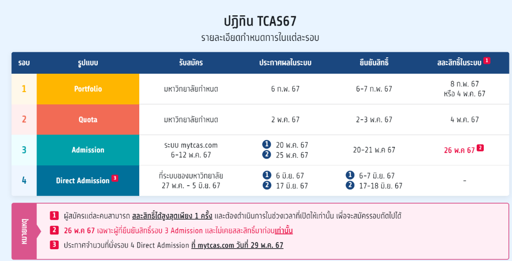 - คนที่ยืนยันสิทธิ์ในรอบ Quota แล้วอยากไปต่อรอบอื่น จะต้องสละสิทธิ์วันที่ 4 พฤษภาคม 67 เท่านั้น