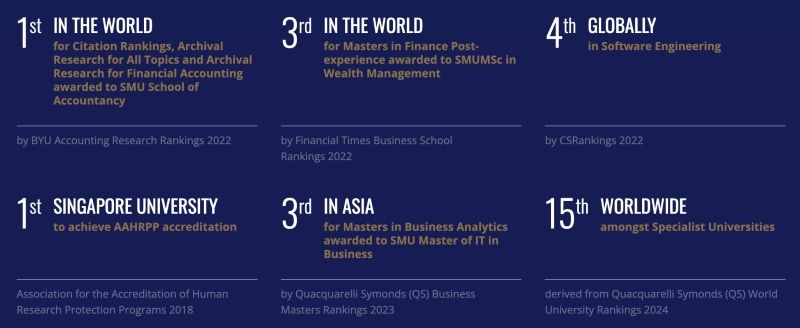นอกเหนือจากจุดแข็งที่สิงคโปร์เป็นประเทศศูนย์กลางทางการเงินของภูมิภาคแล้ว หากเจาะลงมาอีกในระดับมหาวิทยาลัยและสาขาที่เปิดสอน SMU นับเป็นเบอร์ไหนระดับประเทศ ภูมิภาค และของโลก? ภาพด้านล่างนี้จะสรุปอันดับคร่าวๆ ที่แสดงบนหน้าเว็บ https://www.smu.edu.sg/about อัปเดตเมื่อเดือนมกราคม 2567