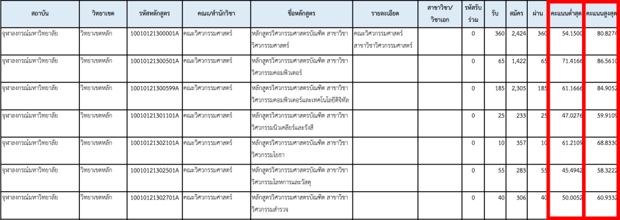 - คะแนนสูงสุด คือ คะแนนของคนแรกที่ผ่านการคัดเลือกเข้าไปในสาขาวิชานั้นๆ หรือคะแนนที่มากที่สุดที่สอบผ่าน