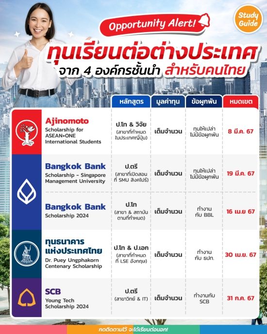 ช่วงนี้ Study Abroad by Dek-D ก็จะมาอัปเดตข่าวทุนแบบคึกคักหน่อย เพราะนอกจากจะมีทุนรัฐบาลจากหลายประเทศกำลังเปิดรับสมัครแล้ว ฝั่งองค์กรเอกชนก็มีทุนเปิดเพียบ และมีโควตามอบให้คนไทยได้ไปเรียนต่อนอกหลายโครงการเลยทีเดียว วันนี้เราได้ลิสต์ทุนจาก 4 องค์กรชั้นนำมาให้แล้ว ใครไม่อยากพลาดโอกาส รีบตามไปเช็กรายละเอียดด่วนๆ เลย~