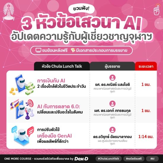 ปฏิเสธไม่ได้เลยว่ายุคนี้อะไรๆ ก็มี AI เข้ามาเกี่ยวข้อง ไม่ว่าจะด้านการศึกษา การทำงาน การใช้ชีวิตประจำวัน ล้วนมีเทคโนโลยีปัญญาประดิษฐ์เข้ามามีบทบาทให้เราต้องปรับตัวตามอยู่เสมอ วันนี้ One More Course เลยขอชวนทุกคนมาฟัง 3 หัวข้อเสวนาบรรยาย จากจุฬาลงกรณ์มหาวิทยาลัย ที่เพิ่งจัดไปเมื่อไม่นานมานี้ ซึ่งเค้าได้อัปโหลดคลิปย้อนหลังให้ทุกคนได้เข้าไปอัปเดตเทรนด์ความรู้ยุคใหม่กันได้ฟรีๆ และยังมีไฟล์เอกสารประกอบให้ดาวน์โหลดฟรีด้วย!