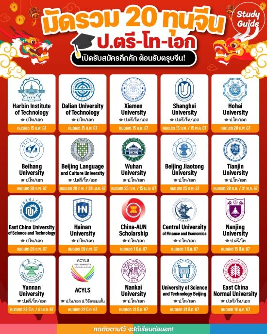 祝你学习进步 ต้อนรับเข้าสู่เทศกาลตรุษจีน วันนี้ Study Guide เลยได้มัดรวมลิสต์ "ทุนรัฐบาลจีน" จากมหาวิทยาลัยต่างๆ ที่กำลังเปิดรับสมัครในช่วงนี้มาฝากกัน บอกเลยว่ามาครบทั้ง ป.ตรี ป.โท ป.เอก รวมถึงหลักสูตรวิจัยระยะสั้น และยังเป็นทุนให้เปล่า ไม่ต้องใช้คืนหลังเรียนจบด้วย~ // ใครอยากบินลัดฟ้าไปล่าปริญญาที่มหาวิทยาลัยชั้นนำในแดนมังกร รีบตามไปส่องกันเลย!!