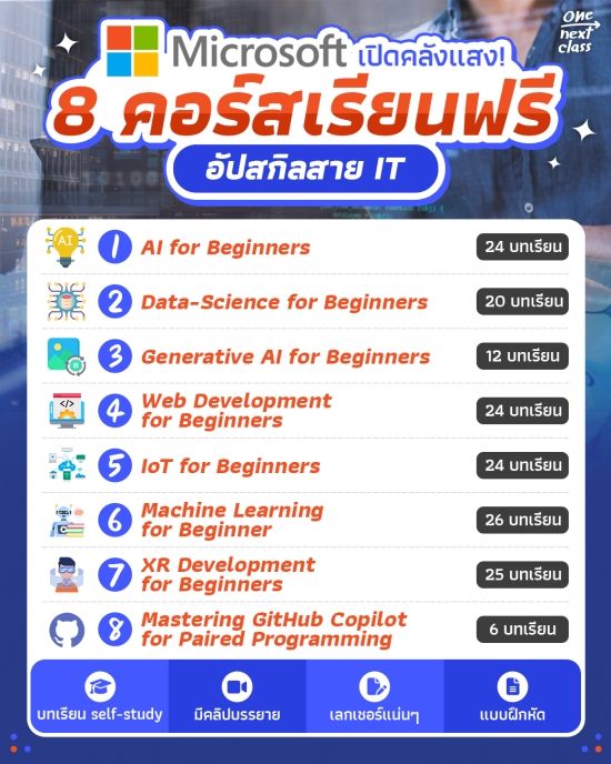 ใครอยาก upskill & reskill ทักษะสาย Tech. แชร์เก็บไว้เลย! One Next Class #ชีวิตติดเรียนรู้ ขอพาไปเปิดวาร์ปคลังแสงจาก Microsoft ซึ่งได้จัดทำ 8 คอร์สให้ทุกคนสามารถเข้าไป self-study ได้ด้วยตัวเองแบบฟรีๆ ไม่ว่าจะเรื่อง GenerativeAI, Data Sci, Machine Learning, IoT หรือ Web development ก็มีให้เรียนครบ เลกเชอร์เน้นๆ มีแบบฝึกหัดให้ได้ลงมือทำจริง แถมเข้าเรียนเวลาไหนก็ได้ หาเวลาว่างแล้วมาเรียนกันเลย!