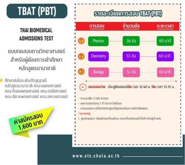 วันนี้มีความคืบหน้าอีกหนึ่งประเด็น เพราะล่าสุดศูนย์ทดสอบทางวิชาการแห่งจุฬาลงกรณ์มหาวิทยาลัย ได้พัฒนาข้อสอบตัวใหม่ที่มีชื่อว่า TBAT (Thai Biomedical Admissions Test) ใช้ยื่นเข้าคณะสายวิทยาศาสตร์สุขภาพในกลุ่มของหลักสูตรนานาชาติ รายละเอียดมีดังนี้ค่ะ