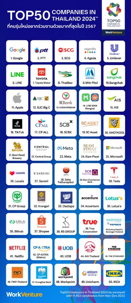 WorkVenture แพลตฟอร์มออนไลน์สำหรับหางานในบริษัทชั้นนำ ได้ทำการสำรวจทาง Online และ Offline ในหัวข้อ “บริษัทในฝันที่คนรุ่นใหม่อยากร่วมงานด้วยมากที่สุด” โดยมีผู้ตอบแบบสอบถามอยู่ในช่วงอายุ 22-35 ปี จบระดับปริญญาตรีขึ้นไป และอาศัยอยู่ในกรุงเทพมหานครและปริมณฑล รวมทั้งหมดกว่า 11,452 คน เข้าร่วมทำแบบประเมินในครั้งนี้ โดย Top 10 องค์กรในปี 2567 มีดังนี้