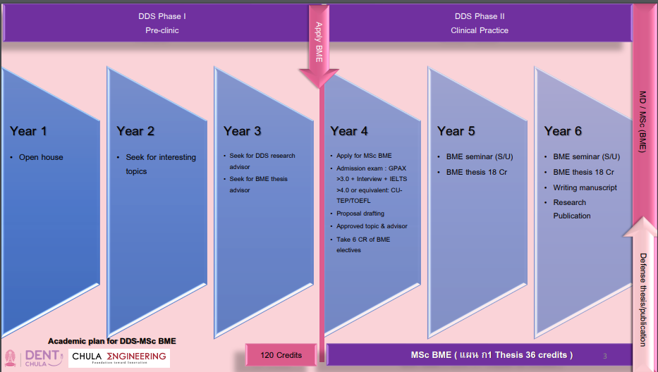 ชั้นปีที่ 2 - 3 : เรียนรายวิชาหลักสูตรทันตแพทยศาสตรบัณฑิตตามปกติ สามารถเริ่มหาหัวข้องานวิจัย และอาจารย์ที่ปรึกษางานวิจัย เพื่อเตรียมความพร้อมก่อนเข้าเรียนหลักสูตรวิศวกรรมชีวเวช