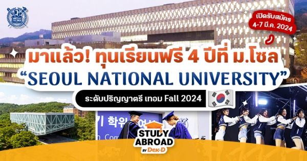 안녕! มีน้องๆ ชาว Dek-D คนไหนกำลังเตรียมตัวสมัครเรียนต่อ ป.ตรี ที่เกาหลีกันอยู่มั้ยคะ? วันนี้พี่พลอยกี้มีข่าวมาอัปเดตว่า ‘Seoul National University’ หรือมหาวิทยาลัยแห่งชาติโซล กำลังจะเปิดรับสมัครนักศึกษาใหม่รอบเทอม Fall 2024 ระหว่างวันที่ 4 - 7 มี.ค.นี้แล้วนะ