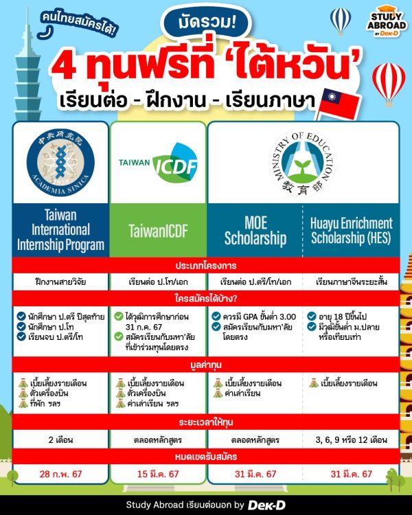 สำหรับใครที่อยากสัมผัสประสบการณ์ใหม่ๆ ที่ 'ไต้หวัน' ตอนนี้ไม่เพียงเป็นฤดูกาลรับสมัครของมหาวิทยาลัยชั้นนำในดินแดนชานมไข่มุกเท่านั้น แต่เป็นช่วงเปิดรับสมัครของทุนการศึกษาประเภทต่างๆ ด้วย ไม่ว่าจะเป็นทุนฝึกงาน, ทุนรัฐบาลไต้หวัน และทุนเรียนภาษาจีน ซึ่งแต่ละโครงการมีโควตาให้คนไทย อีกทั้งยังมอบทุนให้แบบจัดเต็ม! จะมีทุนไหนน่าสนใจบ้าง รีบตาม Study Abroad by Dek-D ไปอัปเดตกันเลยย~