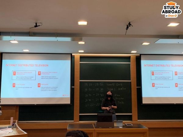ตารางเรียนวีคนึงไม่ได้บีบอัดเกินไป ปริมาณเยอะแบบพอดีๆ บางวิชาอาจจะมีคะแนนการมีส่วนร่วมสัก 10% ส่งงานตรงเวลาอีก 30% ที่เหลือ 60% มาจากการสอบ ส่วนใหญ่วิชาเน้นทฤษฎีอย่างบัญชีหรือไฟแนนซ์ก็จะประมาณนี้ แต่ถ้าเป็นวิชาเฉพาะทาง เช่น ในกลุ่มของ Management in Asia จะเน้นส่งงานมากกว่า (ส่่วนตัวชอบแบบนี้มากกว่าจำไปสอบ)