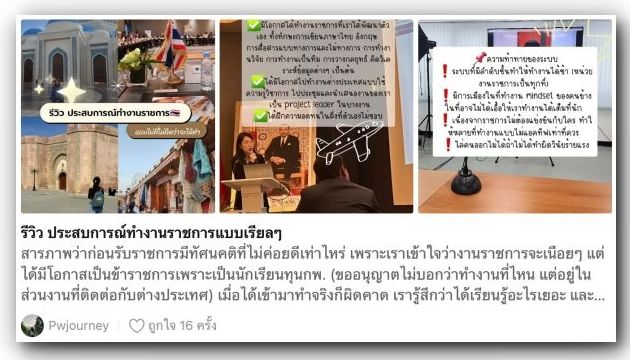 ก่อนไปเรียน พี่ปรางมีประสบการณ์ทำงานมาแล้ว โดยเป็นรุ่นที่เค้าเริ่มทดลองใช้ระบบที่นักเรียนทุน ก.พ.จะต้องเข้าไปทำงานราชการในสังกัดนั้นๆ ก่อน 1 ปีก่อนเรียน ปัจจุบันพี่ปรางจบ ป.โท แล้วและกำลังทำงานที่ "สำนักงานการตรวจเงินแผ่นดิน" (สตง.) ซึ่งเป็นหน่วยทุนต้นสังกัดค่ะ ใครกำลังหาอ่านรีวิวสมัครทุน ก.พ., เรียนต่อ, ฝึกงาน ไปจนถึงชีวิตการทำงานราชการที่มีทั้งข้อดีและข้อจำกัดบางอย่าง ห้ามพลาดเรื่อวราวต่อไปนี้!