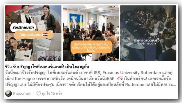 สวัสดีค่ะชาว Dek-D สำหรับใครที่เรียนจบ ทำงาน แต่หัวใจยังบอกว่ามีด้านที่อยากเรียนต่ออยู่นะ! อย่าเพิ่งหมดกำลังใจหรือคิดว่าจะสายเกินไปค่ะ วันนี้เราจะมีรีวิวจาก “พี่ปราง – ชมปรางค์ วงศ์รัศมีเดือน” รุ่นพี่บัณฑิตคณะเศรษฐศาสตร์ ภาคภาษาอังกฤษ ม.ธรรมศาสตร์ ที่เดินตามแพสชันสมัครทุนรัฐบาลไทย (ก.พ.) ไปเรียนต่อ ป.โท Economics of Development ที่ ISS Erasmus University Rotterdam ซึ่งเป็นมหาวิทยาลัยด้าน Social Sciences & Management อันดับ 2 ของเนเธอร์แลนด์ และอันดับ 48 ของโลก *อ้างอิง QS by Subjects 2024