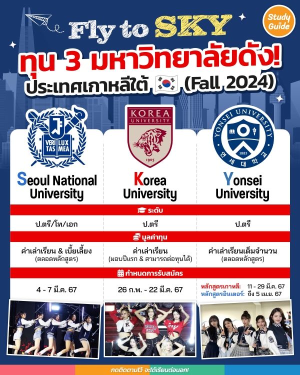 SKY is Calling! ถ้าพูดถึงมหาวิทยาลัยชั้นนำของประเทศเกาหลีใต้ที่หลายคนใฝ่ฝันอยากไปเรียนต่อ เชื่อว่าสถาบันในกลุ่ม “SKY” ซึ่งประกอบด้วย Seoul National University, Korea University และ Yonsei University ต้องเป็นลิสต์อันดับต้นๆ อย่างแน่นอน เพราะมีคุณภาพการเรียนการสอนที่ติด Top 100 ของโลก แถมมีหลักสูตรหลากหลายให้ชาวต่างชาติเลือกเรียน