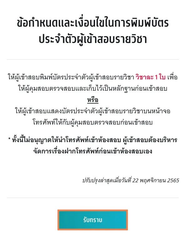 สำหรับใครที่จะแสดงบัตรประชาชนผ่าน ThaiD จำเป็นจะต้องพิมพ์บัตรเข้าห้องสอบลงกระดาษ A4 เท่านั้น จึงจะสามารถใช้แสดงเข้าห้องสอบได้