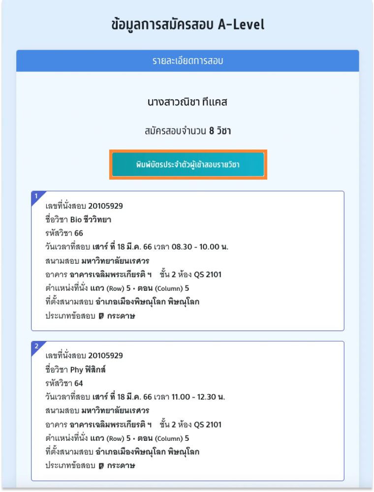 - พรินต์ใส่กระดาษ A4 (สี หรือขาวดำ ก็ได้) และตัดตามรายวิชา ยื่นให้กับกรรมการฯ ก่อนเข้าห้องสอบ