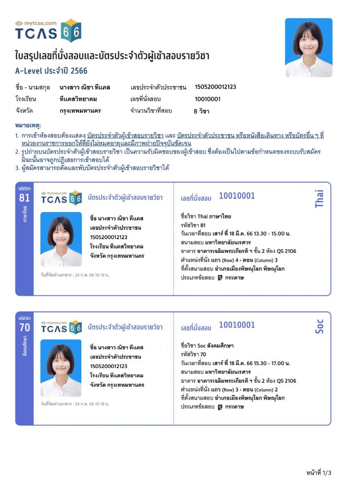 3. กด "พิมพ์บัตรประจำผู้เข้าสอบรายวิชา" ก็จะพบกับไฟล์ PDF ที่มีบัตรประจำตัวผู้เข้าสอบ ซึ่งน้องๆ จะพิมพ์ออกมาใส่กระดาษ หรือบันทึกหน้าจอไว้ในโทรศัพท์ก็ได้ ตามความสะดวก