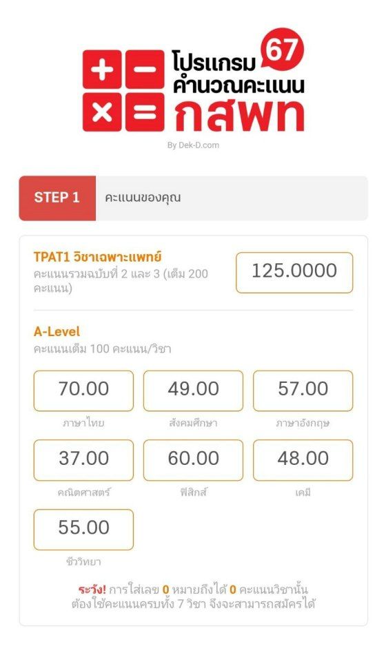 โดยน้องๆ สามารถตั้งคะแนนเป้าหมายแต่ละวิชาได้เลย เช่น คิดว่าเราน่าจะทำคะแนนวิชาคณิต1 ได้ 40 คะแนน ทำฟิสิกส์ ได้ 50 คะแนน เป็นต้น เมื่อตั้งเป้าครบทุกวิชาแล้ว กดคำนวณคะแนน ผลก็จะออกมาว่าเราจะได้คะแนน กสพท เท่าไหร่ เทียบกับคะแนนปีที่แล้วได้มากกว่าหรือน้อยกว่า
