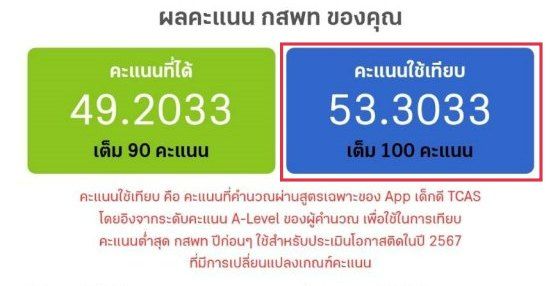 2. คะแนนใช้เทียบ คือ คะแนนที่ผ่านการคำนวณใหม่ เพื่อให้สามารถเทียบกับคะแนนเต็มฐาน 100 คะแนนได้ (ใช้เทียบกับสถิติ กสพท ปีอื่นๆ)