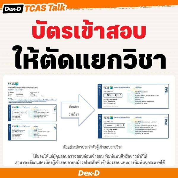 A: ตัดแยกเป็นรายวิชา โดยหลังจาก print ออกมาแล้ว บัตรเข้าสอบจะมีกรอบตามจำนวนวิชาที่สอบเลยค่ะ เราสามารถตัดและยื่นให้กรรมการคุมสอบดูได้เลย ทั้งนี้บางสนามสอบก็อาจจะเก็บบัตรเข้าสอบวิชานั้นๆ ไปด้วย