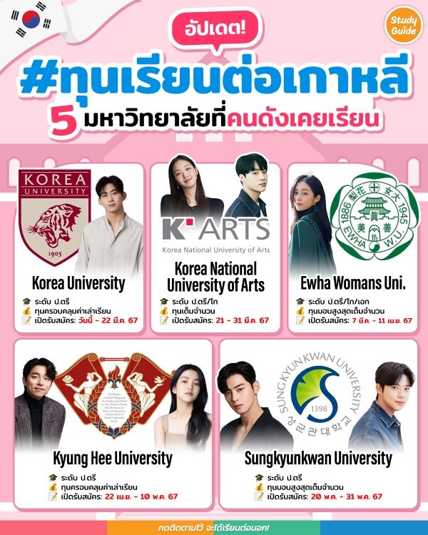 อันยอง! สำหรับน้องๆ ชาว Dek-D ที่เป็นสายเกาหลี วันนี้ Study Guide มีข่าวทุนการศึกษาจาก 5 มหาวิทยาลัยชื่อดังของเกาหลีใต้มาอัปเดตกัน บอกเลยว่าแต่ละที่มีศิษย์เก่าเป็นคนดังมากมาย ใครอยากเป็น #ทีมเกาหลี รีบเช็กรายละเอียดกันด่วนๆ เลยยย~