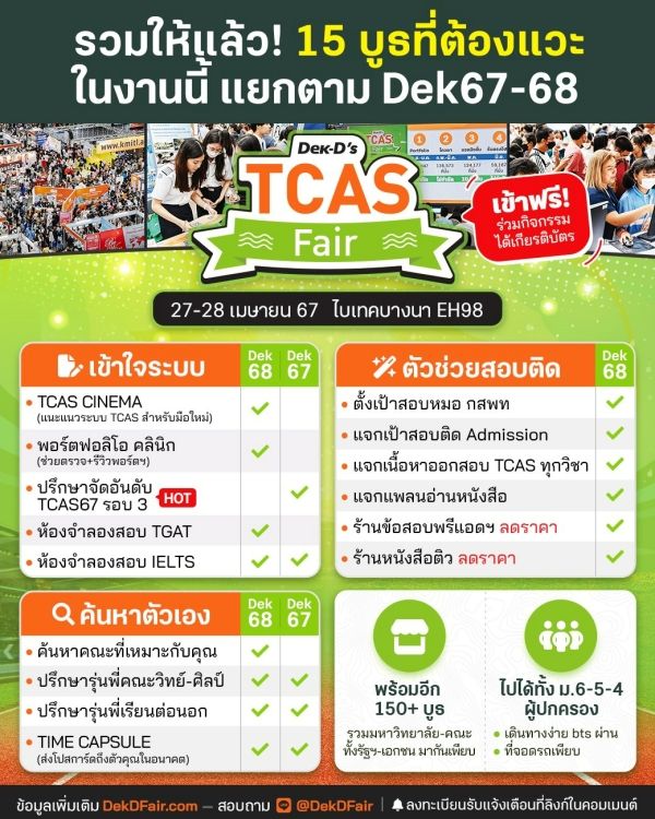 เว็บไซต์ Dek-D จัดงาน Dek-D's TCAS FAIR ที่ไบเทคบางนา ระหว่างวันที่ 27 - 28 เมษายน 2567 ซึ่ง dek67 ที่ยังไม่ได้ยืนยันสิทธิ์ และต้องการจะยื่นสมัคร TCAS รอบ 3 Admission พลาดไม่ได้ เพราะภายในงานมีกิจกรรมมากมายที่จะสามารถช่วยน้องๆ ในการยื่นสมัครรอบนี้ โดยเฉพาะ "บูธปรึกษาจัดอันดับ TCAS67 รอบ 3" และ "บูธปรึกษารุ่นพี่คณะวิทย์-ศิลป์" ที่สำคัญ! กิจกรรมฟรี ไม่มีค่าใช้จ่ายด้วย ถ้าใครสนใจสามารถติดตามรายละเอียดเพิ่มเติมได้ที่นี่ DekDFair.com