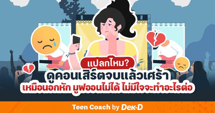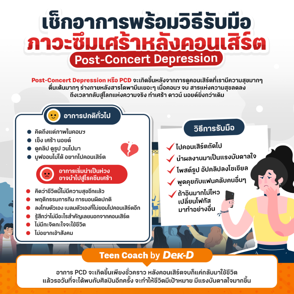หลังจบคอนเสิร์ตหลาย ๆ คนอาจจะเคยพบเจอความรู้สึกเหล่านี้ ทั้งเศร้าซึม ทั้งหน่วง ทั้งโหวง จะเสียใจแต่ก็ไม่สุด ซึ่งอาการเหล่านี้อาจเกิดขึ้นได้ และถูกเรียกว่า Post-Concert Depression หรือ PCD